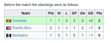 در آخرین بازی مرحله گروهی مسابقات جام کارائیب، در گروه اول مسابقات که ۳ تیمی بود، باربادوس برای رسیدن به فینال باید گرنادا را با دو گل شکست می داد. تا قبل از این بازی، در جدول سه تیمی، گرنادا از یک بازی ۳ امتیاز داشت با تفاضل گل مثبت ۲. پورتوریکو از دو بازی ۳ امتیاز داشت با تفاضل گل منفی ۱، و باربادوس صفر امتیاز یک بازی با تفاضل گل منفی ۱. در نتیجه، باربادوس برای اینکه به مرحله نهایی برسد باید دست کم با اختلاف ۲ گل، گرنادا را شکست می داد که در این صورت هر سه تیم سه امتیازی می شدند، اما باربادوس با تفاضل بهتر راهی مرحله بعد می شد.