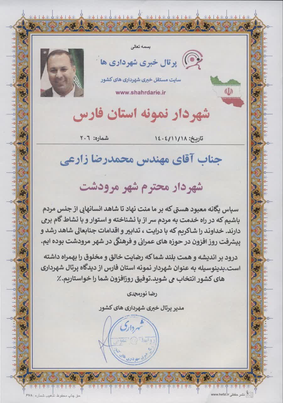 شهردار مرودشت، از سوی پرتال خبری شهرداری های کشور به عنوان «شهردار نمونه استان فارس» در حوزه‌های عمرانی و فرهنگی معرفی شد.