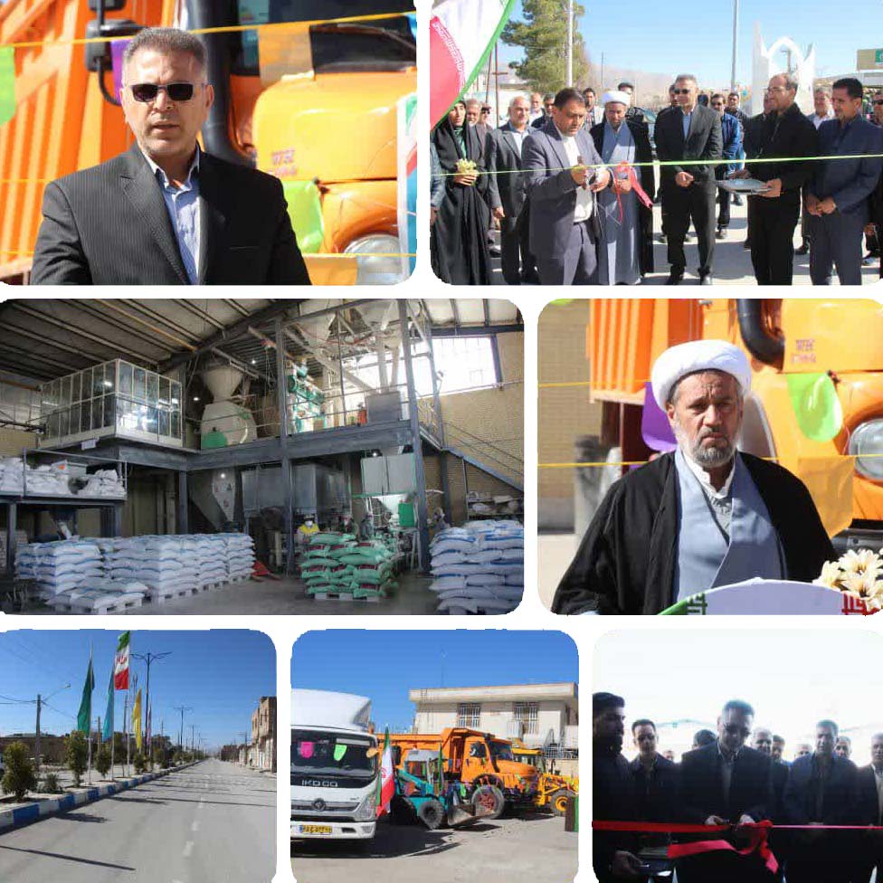 گفتنی است در نهمین روز از دهه مبارک فجر انقلاب اسلامی و در بخش مرکزی، واحد تولید خوراک دام و طیور در شهرک صنعتی فتح آباد با اعتباری بالغ بر پانزده ملیارد تومان با ظرفیت تولید سالیانه 15هزار تن و اشتغالزایی مستقیم برای 14 نفر و پروژه توسعه فیبر رسانی به این شهرک به طول 2700 متر و اعتبار 20 میلیارد ریال افتتاح شد و در ادامه و در شهر زنگی آباد نیز پروژه های موزاییک فرش به متراژ 9 هزار متر مربع، نصب پایه های روشنایی، خرید و نصب مبلمان شهری، بهسازی معابر به متراژ 70 هزار متر مربع، بهسازی کانال و خرید ماشین آلات سبک و سنگین جمعا با اعتبار 418 میلیارد ریال افتتاح شد.